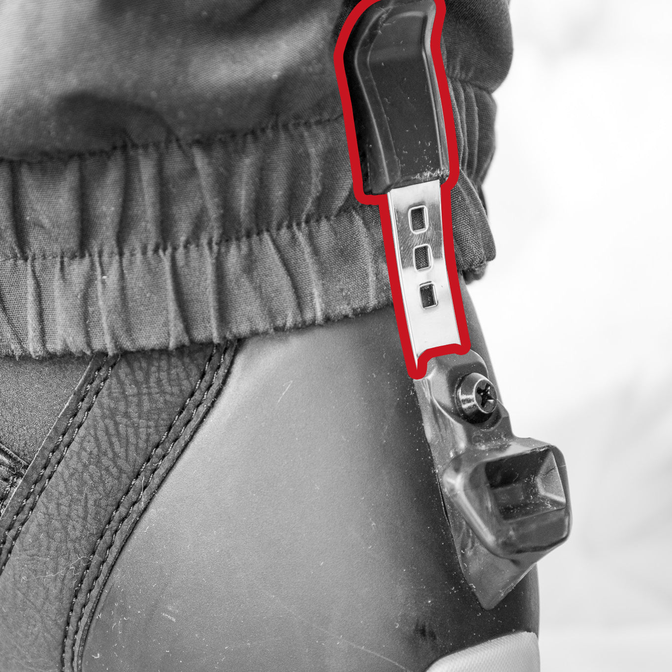 Integrated into the boot backstay, the Cuff Clip neatly manages pant cuffs to ensure a smooth, secure connection with the Heel Cleat.