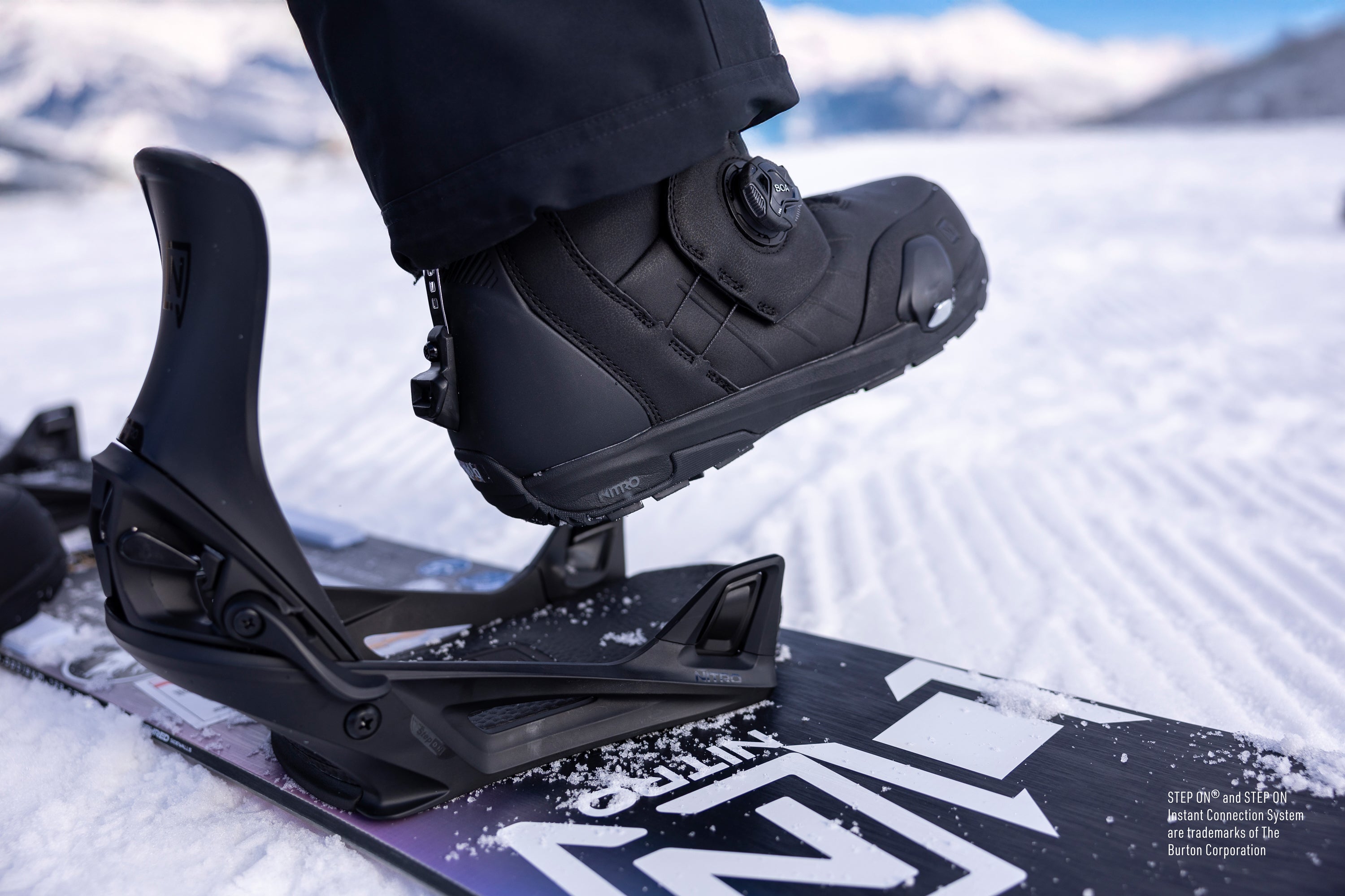 The Nitro Step On binding is a quick boot to binding interface system that has a convenient three point connection. Step On boots feature toe and heel cleats that align with Step On bindings for a easy to use and secure connection. Just Step On and Drop in!