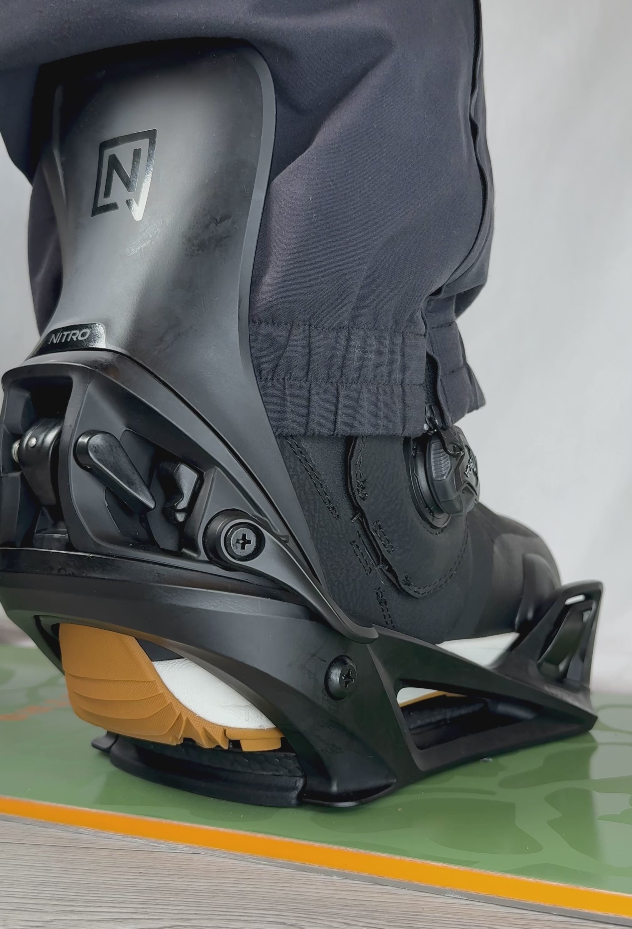 Ensure your boots and bindings are free of snow, ice, or debris. Tighten your boots securely and tuck pant cuffs into the Cuff Clips so they don’t interfere with the Heel Cleat.